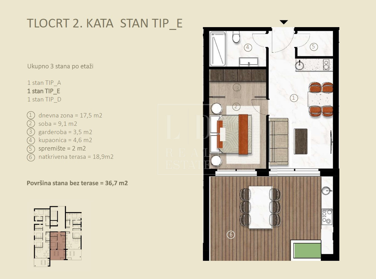 Stan se nalazi na 2 katu zgrade i sastoji se od dnevnog boravka, blagovaone, 1 spavaće sobe, 1 kupaonice, ostave i natkrivene terase/verande veličine 18.9 m2 povezanih sa dnevnim boravkom i kuhinjom.