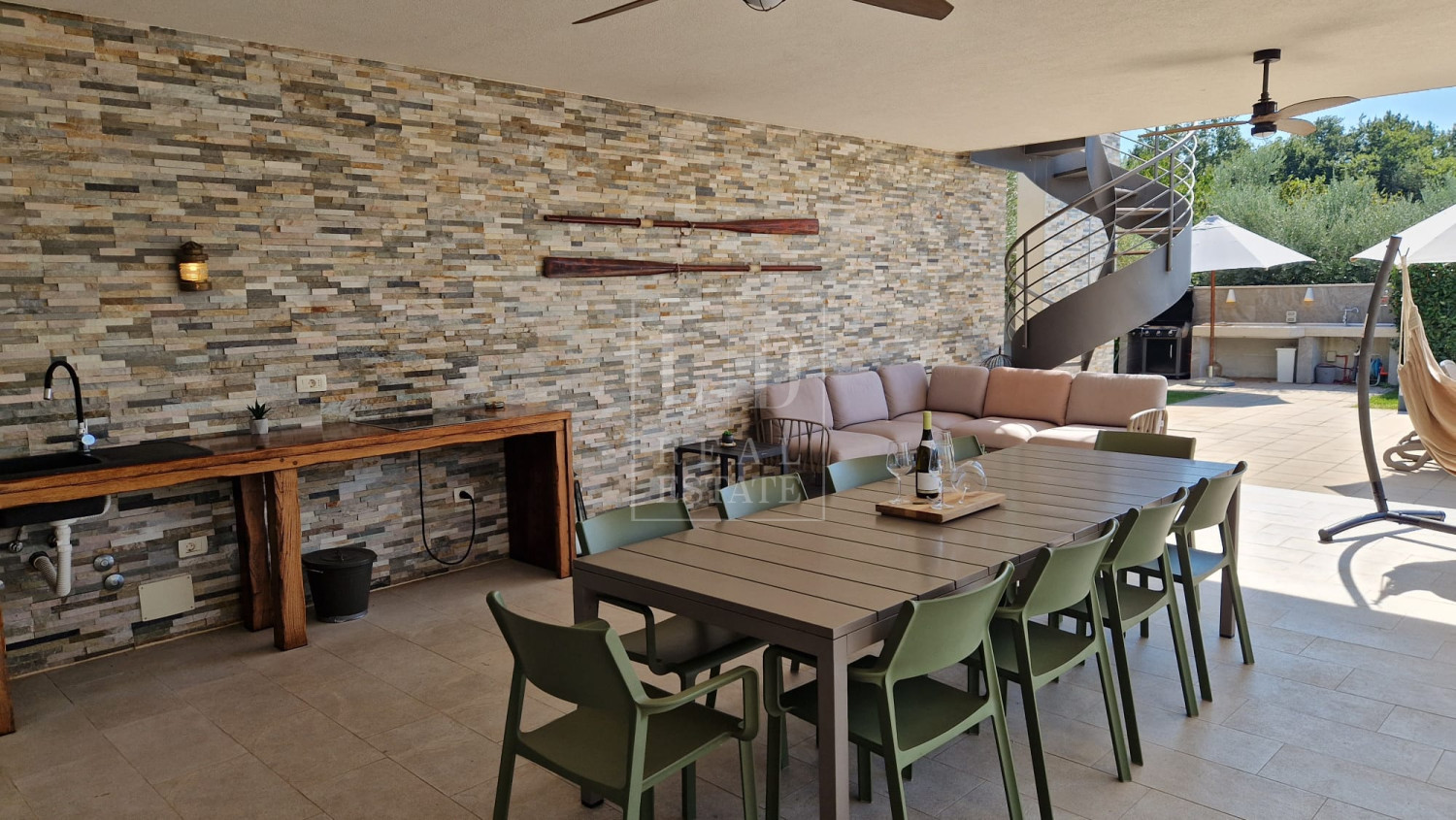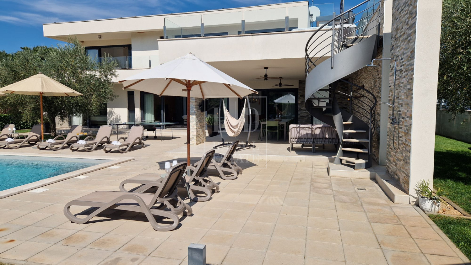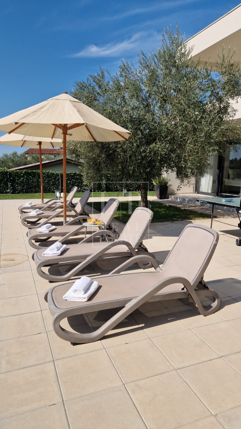 Vila zadovoljava i najzahtijevanije klijente jer nudi vanjski bazen od 40 m2 sa sunčalištem. Bazen i sunčalište imaju potpunu diskreciju jer su orijentirani prema masliniku i jugozapadu gdje je sunce uvijek prisutno. Travnjak od 600 m2 ukrašen starim istarskim maslinama čini pravi autohtoni istarski ambijent.